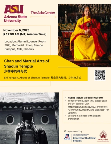 We cordially invite you to join us on November 6th at 11 am for the next lecture on "Chan and Martial Arts of Shaolin Temple 少林寺的禪與武." You can participate either in person at the Alumni Lounge (Room 202), Memorial Union, Tempe Campus, ASU, or virtually via Zoom. This event offers a hybrid format for your convenience. The lecture will be in Chinese with English translation.