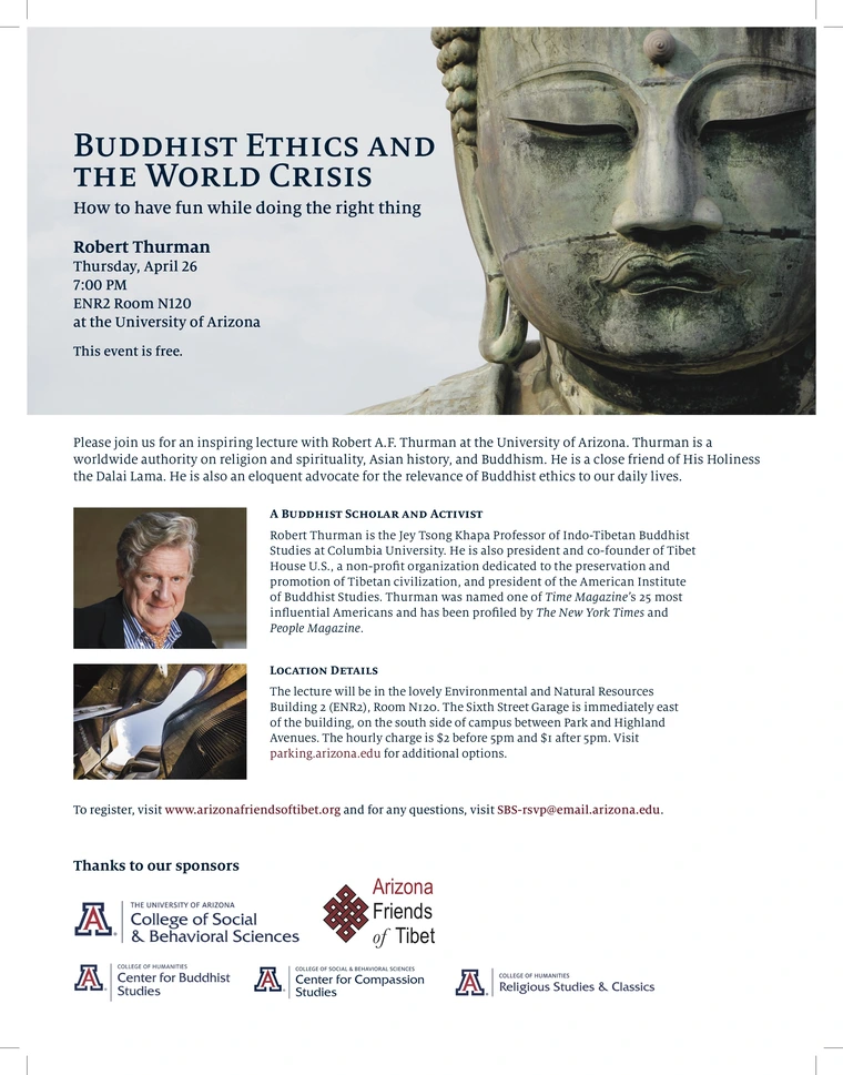 Robert Thurman, the Jey Tsong Khapa Professor of Indo-Tibetan Buddhist Studies at Columbia University, will give a lecture titled “Buddhist Ethics and The World Crisis: How to Have Fun While Doing the Right Thing”